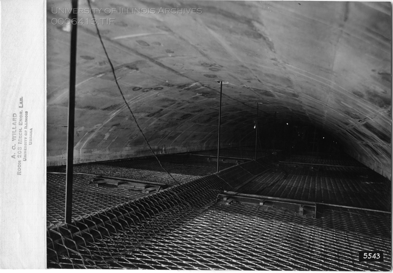 View of form for ceiling slab before concreting, showing steel reinforcing, hangers, and air ports in position. Booth & Flinn, Ltd., Contractor. Camera located in Ring No. 2, north tunnel, at northeast corner of form, looking west."