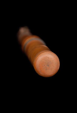 wooden, with single brass pinky key and brass ferrules. Handwritten label on the instrument reading "German."