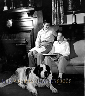 "Fred Schon, left, Holcomb, and Tom Hornsby, 336 11th St., Rochelle, both freshman pre-medical students in the Univ. of Ill., study together in the Theta Chi fraternity where Hornsby is a freshman. Ox, 180-lb. St. Bernard house mascot joined them before the fireplace. Schon is in Kappa Sigma social fraternity."