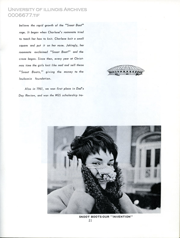 A page from Busey Hall: 50 Years Young - 1916-1966, featuring a close-up photo of Education major Charlene Levine modeling her invention the Snoot Boot, a knit accessory worn over the nose.