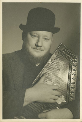 A. Doyle Moore (1931-2013) faculty member of the School of Art and Design at the University of Illinois and member of the Campus Folksong Club holding his autoharp.