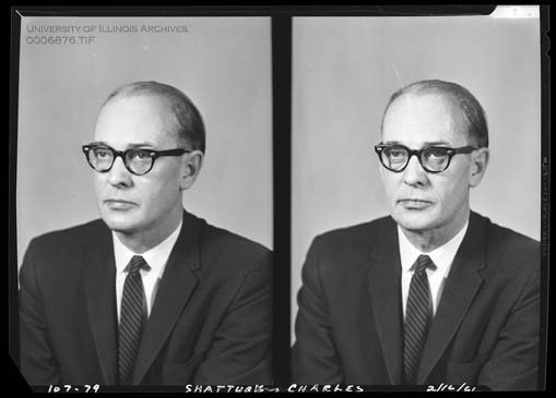 Photo portraits of Dr. Charles Harlen Shattuck (1910-1992) (B.A. 1932, M.A. 1934, and Ph.D 1938), University of Illinois professor of English (1934-79).