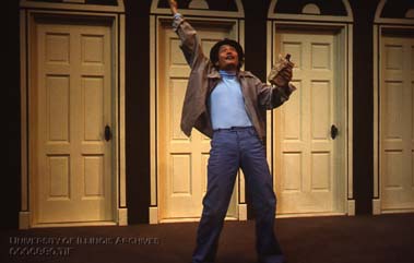 Color photograph of Ang Lee (BFA Theatre 1980) performing in a University Theatre production of Tuesday at the Krannert Center for the Performing Arts Studio Theatre.
