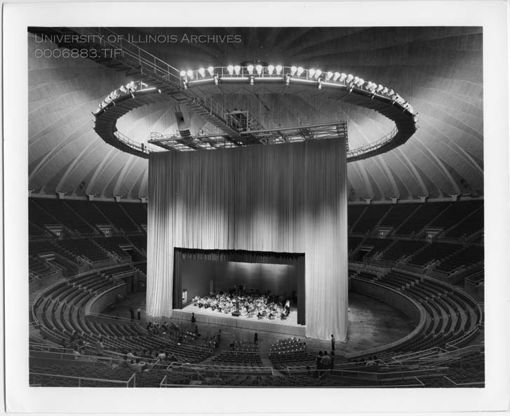Photograph of a long shot of musicians rehearsing on a stage in the Assembly Hall (State Farm Center).