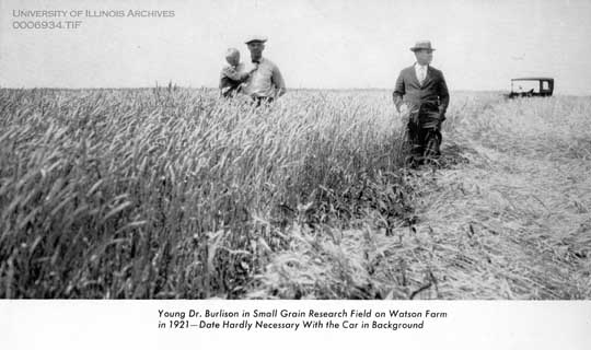 From the caption: "Young Dr. Burlison in Small Grain Research Field on Watson Farm in 1921 - Date Hardly Necessary With the Car in Background"