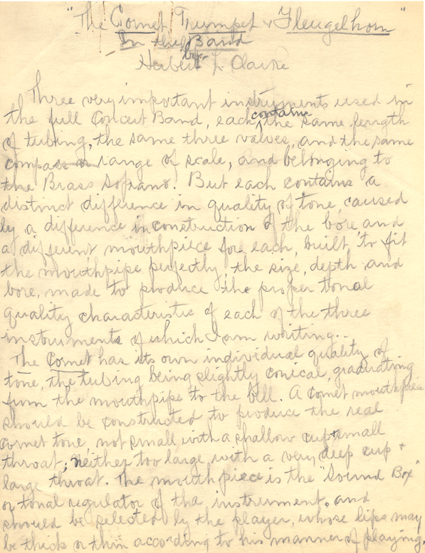 Page 1 of an early draft of The Cornet, Trumpet, and Flugelhorn in the Band written by Herbert L. Clarke