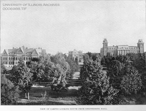 Photograph of the University campus as seen from Engineering Hall, looking south. Visible buildings include (left to right) the Natural History Building, the Chemical Laboratory (now Harker Hall), and University Hall. Originally published in Illio '97 (1896), page 97.