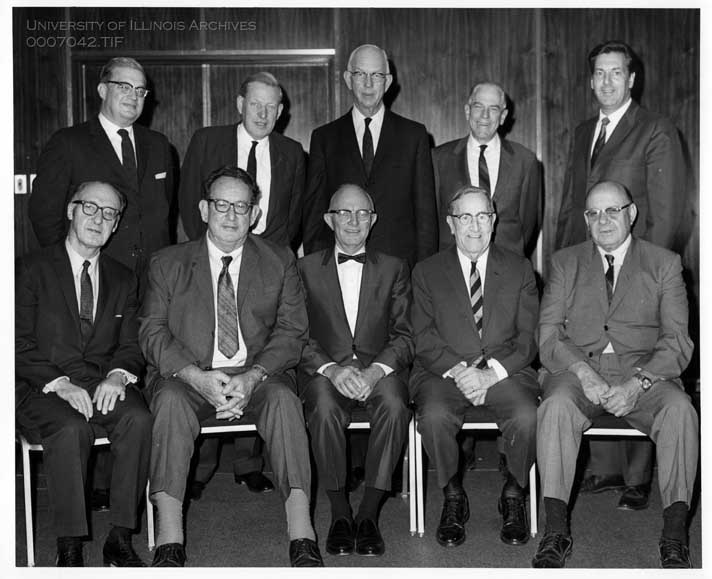 Front row, left to right: Dr. William H. Cook, Dr. David B. Tyler, Dr. George W. Irving, Jr., Dr. Roger Adams, and Dr. Emil M. Mrak.