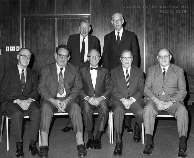 Front row, left to right: Dr. William H. Cook, Dr. David B. Tyler, Dr. George W. Irving, Jr., Dr. Roger Adams, and Dr. Emil M. Mrak.