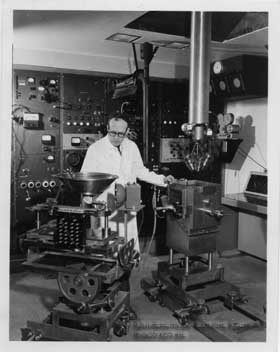 Black and white photograph of Professor William J. Fry checking a new device in the Bioacoustics Laboratory.