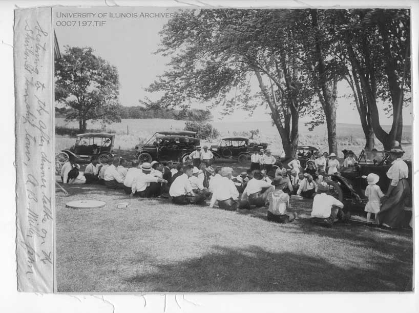 Black and white photograph of people gathering to listen to an after dinner talk on the township farm.