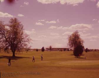 Color photograph of people playing golf on a golf course with Assembly Hall in the distance.